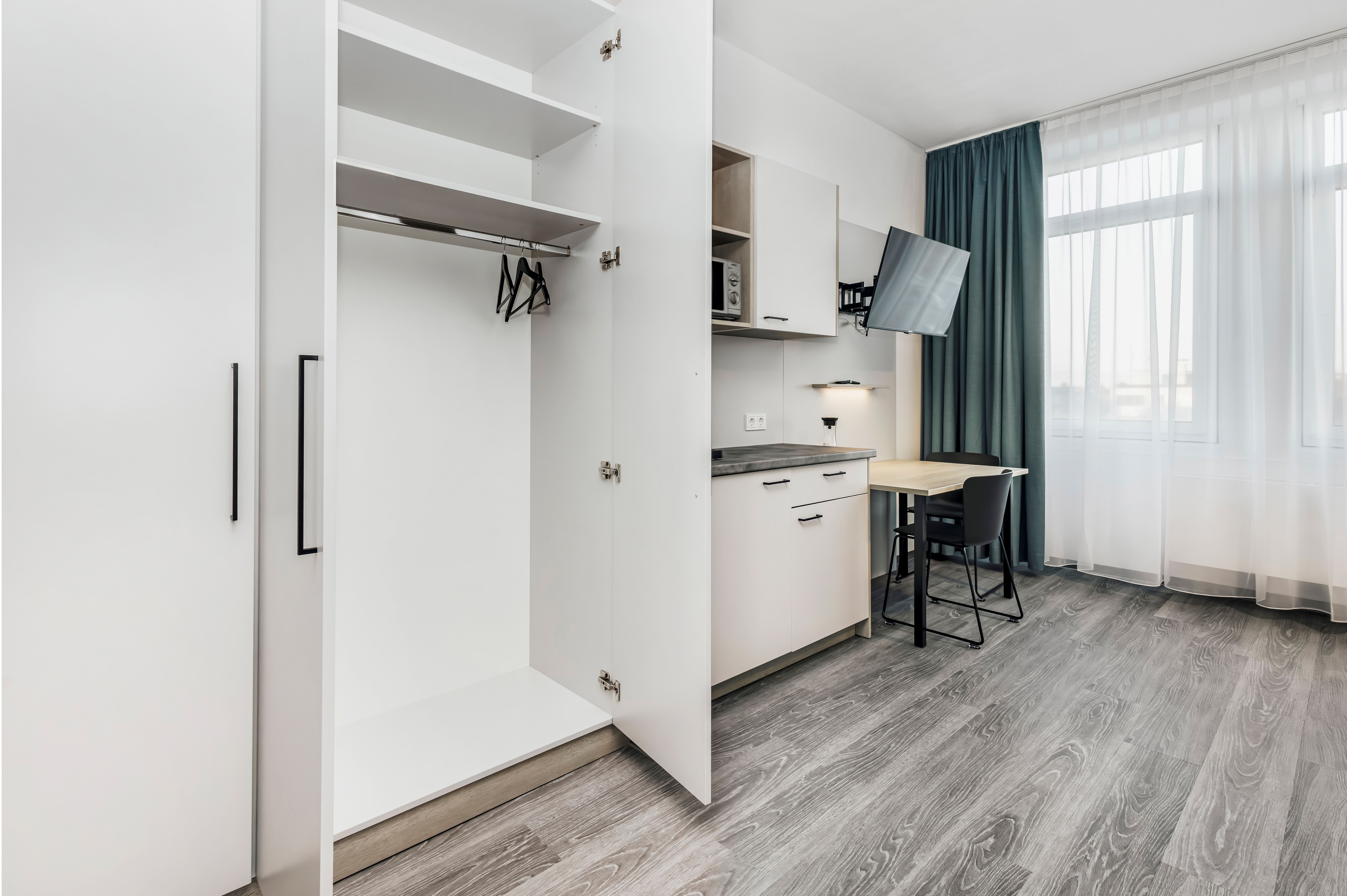 Unser Studio Single bietet auf ca. 26 m² ein komfortables, modernes Zuhause für Alleinreisende. Ein gemütliches Einzelbett, ein praktischer Arbeitsbereich sowie eine voll ausgestattete Kitchenette sorgen für einen angenehmen Aufenthalt – ideal für Geschäftsreisen oder längere Aufenthalte.